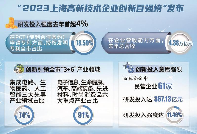 “2023上海高新技術企業(yè)創(chuàng)新百強榜”以2022年度統(tǒng)計數(shù)據(jù)為基礎,從創(chuàng)新投入、創(chuàng)新人才、創(chuàng)新產(chǎn)出等角度對上海高企創(chuàng)新發(fā)展成果和綜合能力進行評價。統(tǒng)計顯示,上海高企研發(fā)投入強度去年首超4%。在PCT(專利合作條約)申請專利方面,上海高企申請數(shù)量占全市62.23%,授權發(fā)明專利全市占比78.59%;在企業(yè)營收能力方面,上海高企去年總營收4.38萬億元,企均凈利潤3030.50萬元。