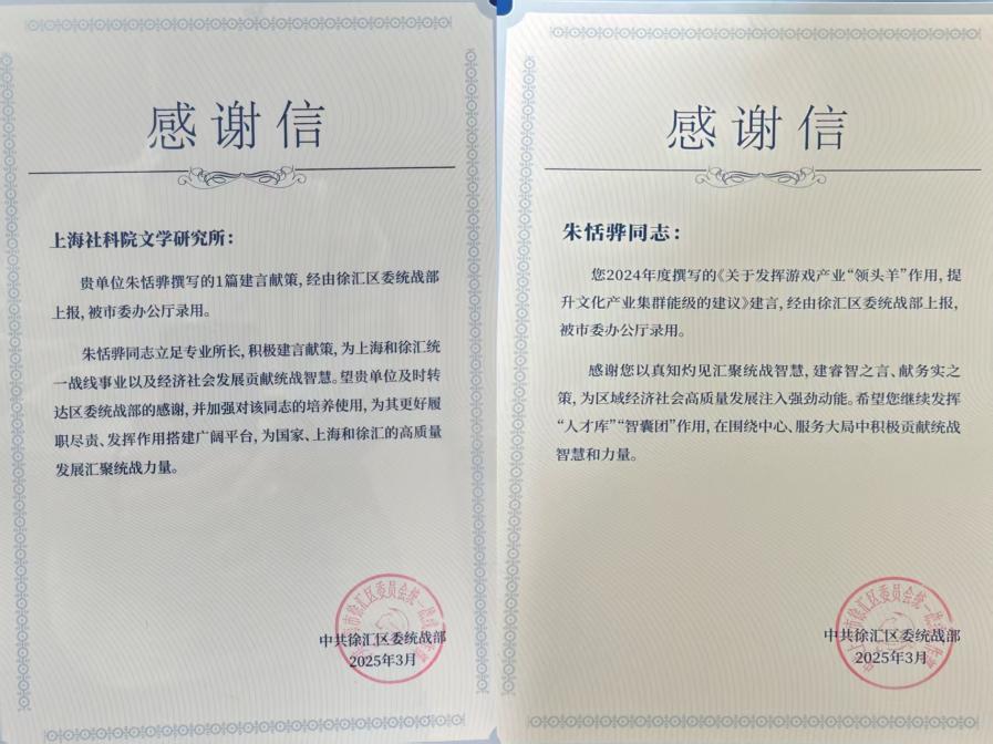 朱恬驊同志撰寫(xiě)的《關(guān)于發(fā)揮游戲產(chǎn)業(yè)“領(lǐng)頭羊”作用,提升文化產(chǎn)業(yè)集群能級(jí)的建議》被市委辦公廳錄用,并獲徐匯區(qū)委統(tǒng)戰(zhàn)部頒發(fā)感謝信,表彰其在聚智匯力、服務(wù)區(qū)域經(jīng)濟(jì)社會(huì)高質(zhì)量發(fā)展中的積極貢獻(xiàn)。