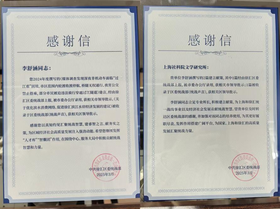 近日,文學(xué)研究所李舒涵、朱恬驊兩位青年科研人員在建言獻(xiàn)策工作中取得優(yōu)異成績(jī),獲得徐匯區(qū)委統(tǒng)戰(zhàn)部表彰。